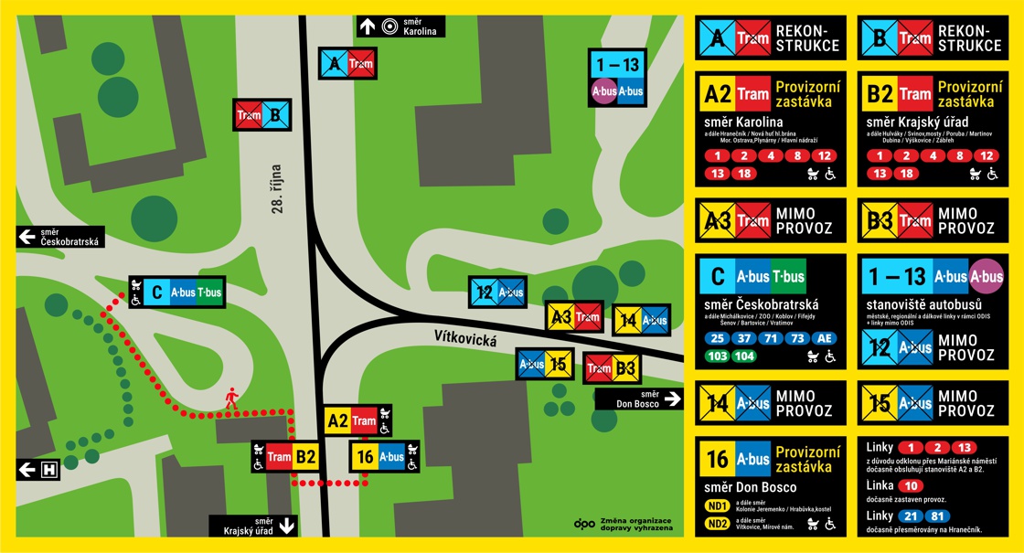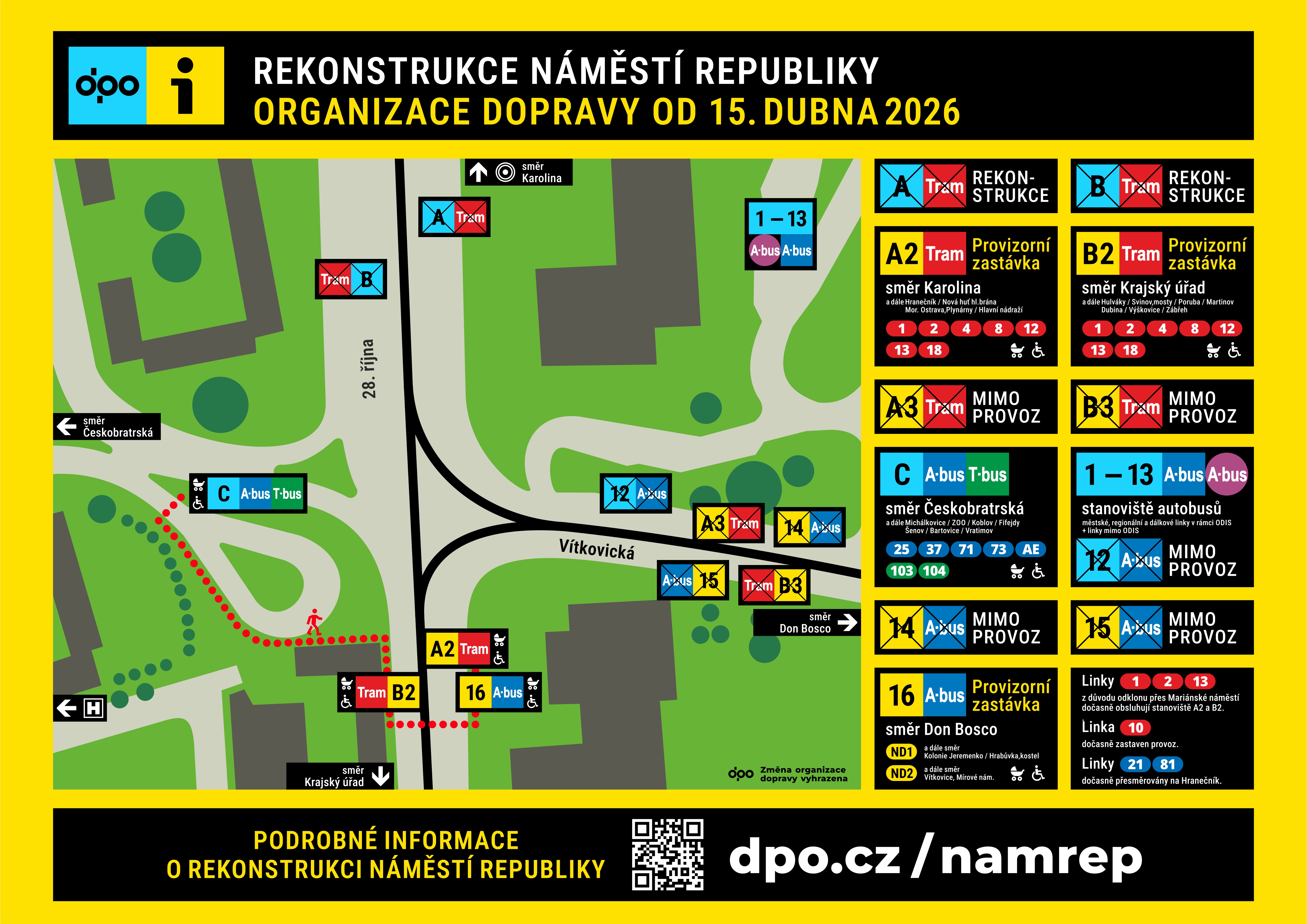 Od středy 15. dubna 2026 (00:00 h) do pondělí 8. června 2026 (24:00 h), z důvodu pokračující rekonstrukce dopravního uzlu náměstí Republiky, částečné uzávěry ul. 28. října a opravy kolejí na ul. Vítkovické, dojde k přemístění tramvajových a autobusových zastávek.